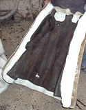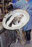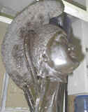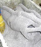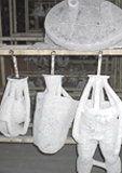 The waxes are dipped into a solution; then dipped into glue; then dipped into a very fine sand. The pieces have to dry and harden. After the pieces have harden, they are again dipped into glue and then into a thicker sand. This is done three or four times until the pieces become hard like a rock. These new molds are known as "investment molds".