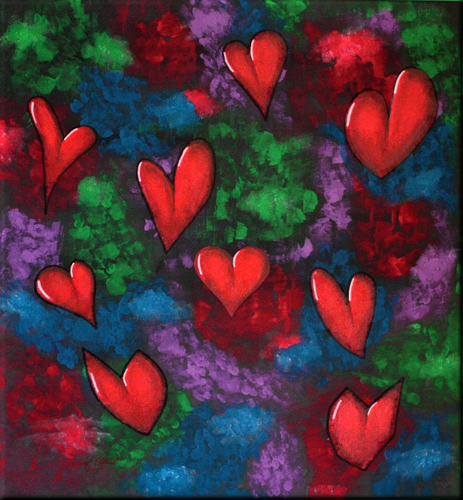 The painting represents the state of romance in the USA. The heart in the middle is the heart of a child, which some small part must remain in us if we are to really experience romance. Romanic love is a gift from the universe. |