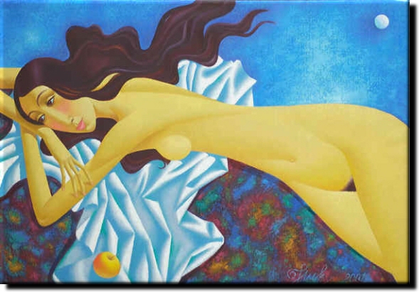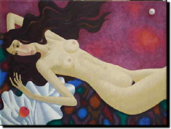 Nude In Blue is a large original oil on canvass where the artist wants you to feel his painting's direct and strong effect of color and form. Note the optical qualities of light and color. Beautiful lucid patterns seem to fold into each other yet remaining apart. The elongated body, flowing hair, delicate fingers and hands are subtly and deliberately painted to present his view of how powerfully we can be affected by a woman. The apple represents Eve. She is pleasantly pleased with herself. The artist expresses the mystical beauty that radiates from an idealized woman. Eduard has applied the most exacting standards.