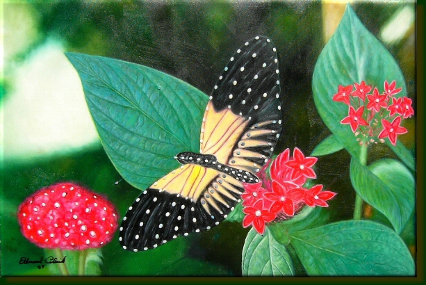 Edward has created a work of art using 171 opals . The gems become an integrated part of his painting. The gems are not just decorative but are a third dimensional aspect of his art. There are 171 opals on the painting. They are used to enhance the butterfly. Oil on canvass board. 32" x 42" Signed: Edward Colarik |