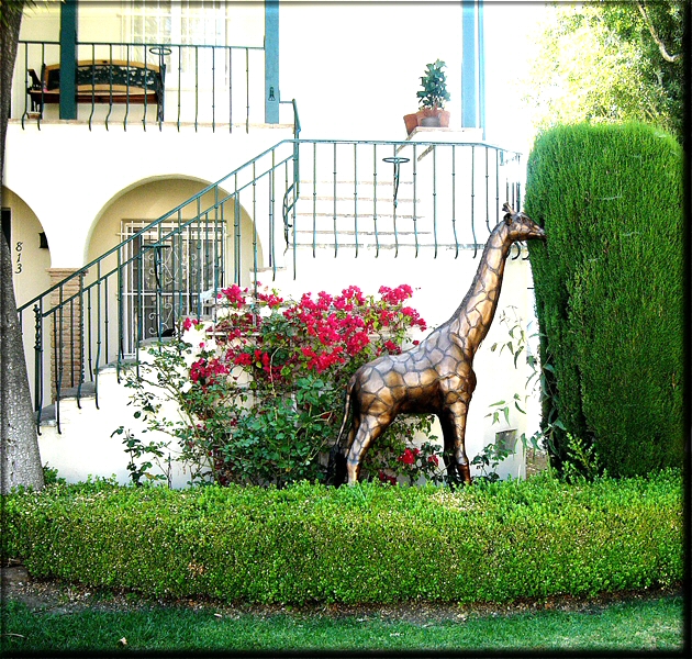The giraffe are one if not the most elegant animals in Africa. It is difficult to describe their grace until seen in the wild. The giraffe was Dali's favorite animal. They eat the top of the trees and the sculpture is displayed in a somewhat similar setting. |
