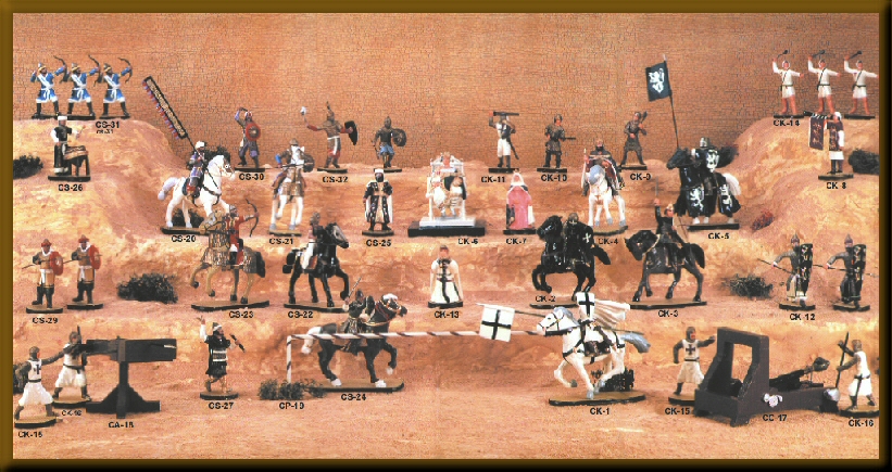 For those who appreciate superb sculpture and a re-enactment of history, we are proud to offer a collection of Crusaders and Saracens from the era known as the Crusades. The figures are uniquely created with style and grace. This award winning collection, by the artist Ed Colarik ,of the Crusaders and Saracens are created in 54mm (2 ¼ ") pewter . The collection creates a rewarding experience of an era that only lasted about 200 years but who’s historical impact is being felt even today. Note the dramatic animation of each piece, the exquisite flow of the robes, the treatment of the mail (amour) and most of all the special attention to authenticity. Each figure is singularly hand-caste of the highest quality pewter, delicately hand painted; signed and dated by the artist. This dramatic pewter sculptures cost between $18 to $45 each.