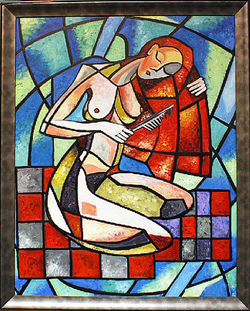This a large oil on canvass. 44" x 55" (110cm x 140cm). The painting is an impressive achievement. The over all look of the painting is very complex yet always maintains a sense of order and balance. The nude woman dominates the central space but remains graceful and lovely. A bold simplification. Everything is in place. The application of a layering paint over the clear cut stain glass effects enhances a sense of harmony and depth. A wonderful piece of art at an extremely good value.